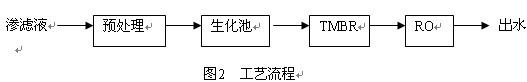 出水排放執(zhí)行生活垃圾填埋污染控制二級標準(GB16889—1997),處理后排入市政管網(wǎng)。處理工藝簡圖如圖2: