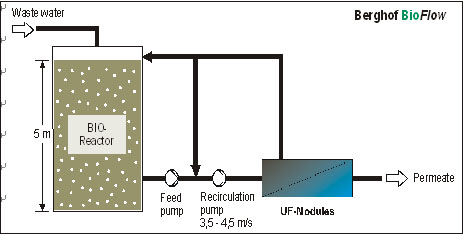 CMBR技術(shù)是用膜替代傳統(tǒng)活性污泥法的二沉池,通過(guò)泵將生化池內(nèi)的污泥-水混合液直接打入膜管內(nèi),在壓力的驅(qū)動(dòng)下進(jìn)行膜分離,出水透過(guò)膜進(jìn)入產(chǎn)水箱,而污泥和濃縮液回到生化池繼續(xù)參與生化反應(yīng)。CMBR技術(shù)采用德國(guó)BERGHOF大通道管式超濾膜,該膜的膜管直徑從5mm到12.5mm,截留孔徑可精確到30nm,能有效截留廢水中的污泥、膠體、懸浮物以及大分子有機(jī)物等,使用膜通量高達(dá)70-140L/(m2.h),是浸沒(méi)式的5-10倍。CMBR系統(tǒng)原理如圖1所示。