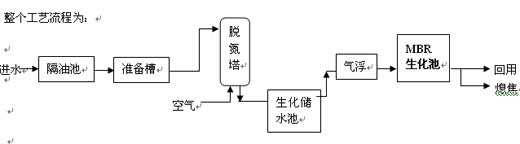 焦化廢水經(jīng)過(guò)隔油池去除焦油后,流入準(zhǔn)備槽。進(jìn)料泵從準(zhǔn)備槽取水,將污水送入脫氮塔脫氮,脫氮塔出水冷卻后,通過(guò)氣浮進(jìn)一步去除水中細(xì)小懸浮物和乳化油成分,然后將廢水送至膜生物反應(yīng)池。在生化池里,先后進(jìn)行厭氧、兼氧、好氧反應(yīng),通過(guò)硝化反硝化反應(yīng),進(jìn)一步脫除焦化廢水中的剩余氨氮和COD等其它污染物,使一些大分子有機(jī)物斷鏈分解脫除。生化綜合池出水再進(jìn)外置式的管式膜組件。管式膜組件的出水進(jìn)清水池,可排放或回用。同時(shí),管式膜組件要打回流,回流水仍然進(jìn)入?yún)捬醭亍?/p>