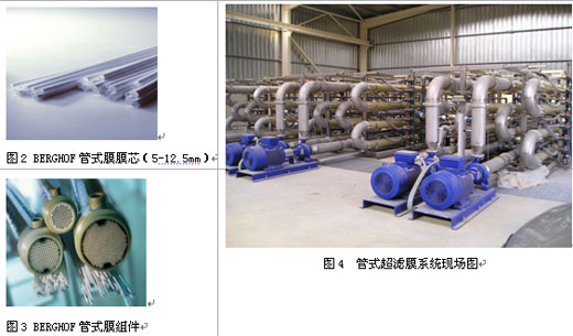 MBR投資成本在1.2萬(wàn)元/噸水左右,運(yùn)行成本為4.8元/噸水(包含人工、能耗等費(fèi)用)。為了降低成本,CMBR工藝還專(zhuān)門(mén)采用了目前世界上最長(zhǎng)和最大的BERGHOF管式超濾膜組件,單組系統(tǒng)日處理能力可達(dá)500噸以上,使得投資成本又大大降低。BERGHOF管式膜及膜組件如圖2-4。