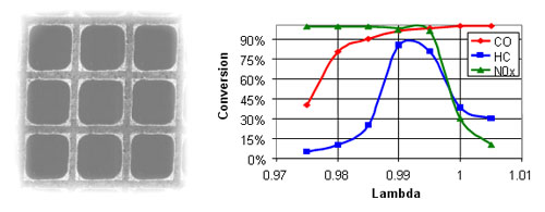 TRUNETT“汽車三元尾氣凈化器”主要由兩種不同類型的觸媒所組成:還原型觸媒和氧化型觸媒。首先有毒氣體先流經(jīng)還原型觸媒,這部分觸媒主要是涂敷在蜂窩瓷壁表面的貴金屬鉑和銠所組成,在這部分發(fā)生的是還原反應(yīng),有毒的NOx氣體被還原成了氮?dú)夂脱鯕;然后有毒氣體開始流經(jīng)氧化型觸媒,這部分觸媒主要是由涂敷在蜂窩瓷壁表面的貴金屬鉑和鈀所組成,未燃燒的HC和CO在這部分發(fā)生的是氧化反應(yīng),轉(zhuǎn)化成了二氧化碳和水蒸汽;同時(shí),在NOx被還原時(shí)所產(chǎn)生的氧氣,又促進(jìn)了HC和CO所發(fā)生的氧化反應(yīng),使其達(dá)到更好的轉(zhuǎn)化效果。