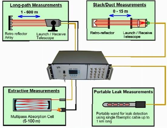 LasIRTM系統(tǒng)包括內(nèi)置可調(diào)諧激光器的分析儀、發(fā)射激光光束并穿過被測介質(zhì)的光學(xué)發(fā)射端、安裝在被測介質(zhì)另一端接收透射光的接收端。分析控制器(分析儀)自身可以安置在遠離現(xiàn)場監(jiān)測點1km之外的控制室內(nèi),現(xiàn)場光學(xué)傳感系統(tǒng)與分析控制器之間通過光纖和同軸電纜連接,測量的數(shù)據(jù)被保存在LasIRTM系統(tǒng)的分析控制器內(nèi)的閃存卡或外部電腦上,外部電腦通過以太網(wǎng)網(wǎng)口或RS232端口與分析控制器連接,數(shù)據(jù)信息也可以傳送到企業(yè)的數(shù)據(jù)庫。