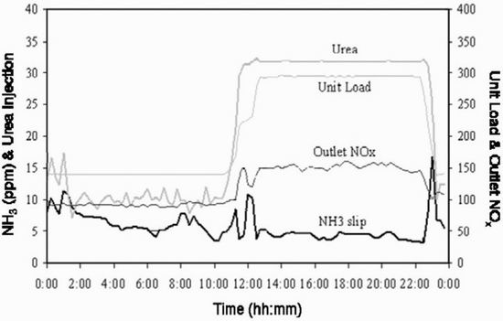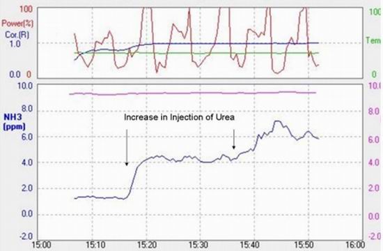圖3包括了氨氣逃逸、尿素注入、NOX排放及鍋爐總負荷的曲線走勢。顯示了隨鍋爐負荷改變而變化的相應(yīng)參數(shù)信息。當大約在11:00am鍋爐負荷發(fā)生變化時(負荷增加),尿素注射量也隨之增加,結(jié)果出現(xiàn)了兩次氨逃逸的峰值:在第一次峰值出現(xiàn)時,NOX排放維持在一個低水平,這與當初預(yù)計NOX排放會隨鍋爐負荷的增加而增加是不同的,峰值之后的氨逃逸量變化與NOX排放量變化趨勢出現(xiàn)了相一致情況;第二次氨逃逸峰值出現(xiàn)與NOX排放量增加是完全趨勢一致的,這兩個峰值的情況似乎與負載的一個小平穩(wěn)期有關(guān)。當鍋爐負荷再次降低時,類似的氨逃逸峰值出現(xiàn)在大約23:00,其他的峰值如在0:00,02:00和08:00,這些氨逃逸量的波動與尿素注入率都存在相互關(guān)聯(lián)性?偟膩碚f,在鍋爐低負荷期間,過量注入尿素導(dǎo)致了氨逃逸量的增加。