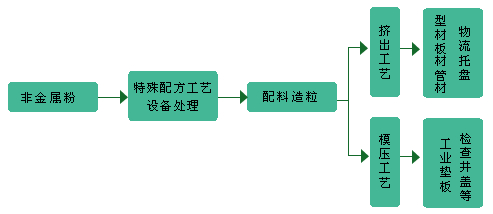 非金屬粉末經(jīng)特殊工藝處理后,直接作為塑膠填充改性材料及活性粉體材料使用,具有較好的使用價(jià)值?梢陨a(chǎn)物流托盤、工業(yè)墊板、室外景觀材料、市政工程用排污管道、檢查井蓋等產(chǎn)品。