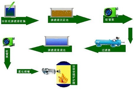 國內的生活垃圾不像西方發(fā)達國家那樣在丟入垃圾桶時就已經(jīng)完成分類。通常,生活垃圾種含有各種有機和無機的廢棄物, 生活垃圾經(jīng)過堆積發(fā)酵后產(chǎn)生的高濃度有機廢水,在進入焚燒爐焚燒之前都需要先將垃圾中的水分去除,垃圾中的水分會收集在垃圾坑滲濾液收集池中,被收集的滲濾液會經(jīng)過垃圾滲濾液沉淀池的沉淀,初步沉淀顆粒比較大的固體,使用VERDER工業(yè)軟管泵將這些滲濾液輸送到過濾器中,過濾掉無法沉淀的固體顆粒。而過濾后的滲濾液泵輸送到清液池中,最后再通過VERDER軟管泵將這些無固體顆粒的垃圾滲濾液通過霧化噴嘴噴入焚燒爐中進行燃燒。