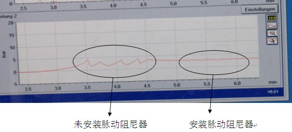 一,管路受外界撞擊嚴(yán)重,嚴(yán)重的撞擊使得系統(tǒng)管路容易松動(dòng),從而導(dǎo)致滲漏現(xiàn)象。從上圖中可以看出安裝脈動(dòng)阻尼器,可以消除近90%的脈動(dòng)。