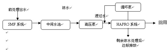 “SMF+HAPRO”濃水循環(huán)中水回用技術(shù)是廈門(mén)市威士邦膜科技有限公司和廈門(mén)綠邦膜技術(shù)有限公司合作研發(fā)的一項(xiàng)工業(yè)廢水深度處理及回用技術(shù)。其中SMF是基于“一種中空纖維多孔膜過(guò)濾組件”等多個(gè)專(zhuān)利技術(shù)而集成的高效超濾系統(tǒng),該系統(tǒng)的膜組件單邊出水、另一邊曝氣,采用U形結(jié)構(gòu),可增大膜面積,增強(qiáng)膜的自清潔能力。HAPRO是基于“一種反滲透膜組件”等多個(gè)專(zhuān)利技術(shù)而集成的短流程、大通量、抗污染型節(jié)能高效反滲透膜處理系統(tǒng),其創(chuàng)新性在于率先采用了“濃水循環(huán)”(或稱(chēng)“濃水在線增壓回流”)和“雙向進(jìn)水”技術(shù),彌補(bǔ)了一般反滲透系統(tǒng)膜容易污堵的缺點(diǎn),抗污染能力強(qiáng),而且具有節(jié)能效果。