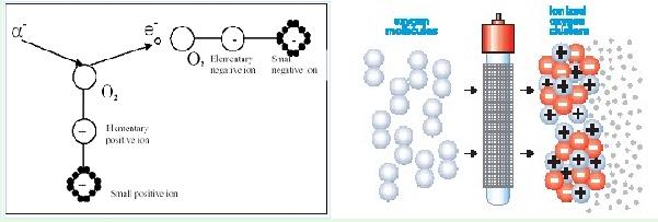 OT(離子除臭方法)實(shí)際上是化學(xué)法的一種,其工作原理是指在常溫下,空氣通過(guò)高能離子發(fā)生裝置時(shí),α顆粒撞擊中性的氧分子,使中性分子失去電子變成正極基本離子,而釋放的電子在瞬間與另一中性分子結(jié)合,形成負(fù)極基本離子。基本離子的兩極分化,發(fā)射出的高能量電子碰撞而形成分別帶有正、負(fù)電荷的氧離子(原理見(jiàn)下圖),并且各吸附10-20個(gè)分子形成離子群。因氧化氫、.OOH的催化作用,并且產(chǎn)生 O2、O2-、O2+、•OH、•HO2、•O、O等氧簇聚集體,具有極強(qiáng)的氧化能 力,因此我們稱(chēng)其為“活性氧”;钚匝醯难趸芰κ茄鯕獾1000倍,我們把這些高能活性的氧離子稱(chēng)為高能活性氧.