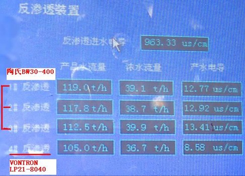該項(xiàng)目于2004年3月份完工,反滲透系統(tǒng)在4月份投入使用。反滲透系統(tǒng)設(shè)計(jì)總產(chǎn)水為400噸/小時(shí),共有4套反滲透膜系統(tǒng),單套產(chǎn)水量100噸/小時(shí)。其中3套(1#,2#,3#)選用的膜元件為陶氏BW30-400(400ft2),4#反滲透系統(tǒng)選用匯通VONTRON LP21-8040(365ft2)膜元件。單套反滲透系統(tǒng)排列11x6:6x6 ,膜元件共計(jì)102支。