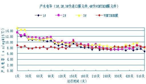從山西鋁廠熱電分廠生產(chǎn)純水改造項(xiàng)目成功運(yùn)行可以看出,用“反滲透膜法+混床”水處理工藝代替“陰陽(yáng)床+混床”處理工藝,不僅降低生產(chǎn)成本,而且可以降低對(duì)環(huán)境的污染,節(jié)約水資源。同時(shí)從匯通VONTRON LP21-8040反滲透膜元件與陶氏BW30-400反滲透膜元件幾年的對(duì)比運(yùn)行可以看出,國(guó)產(chǎn)的反滲透膜元件與國(guó)外品牌的反滲透膜元件的性能和品質(zhì)已相差無(wú)幾,在相同的完善預(yù)處理?xiàng)l件下,系統(tǒng)均能長(zhǎng)期穩(wěn)定運(yùn)行。