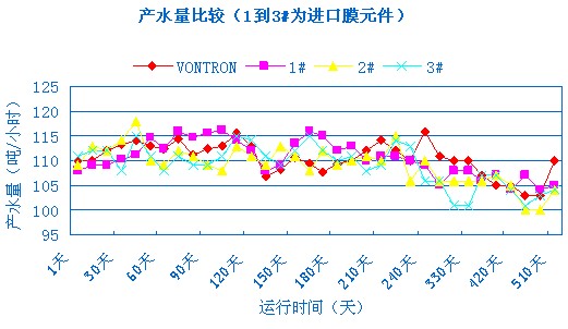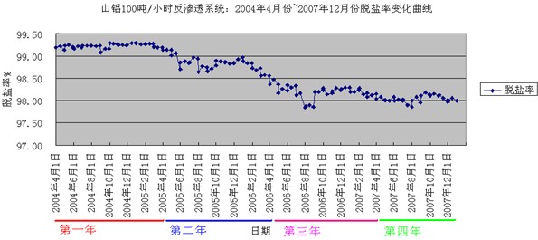 運(yùn)行3年后VONTRON LP21-8040膜系統(tǒng)的脫鹽率及產(chǎn)水量的變化情況: