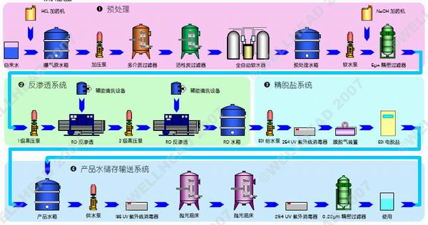 超純水系統(tǒng)分為預(yù)處理、反滲透系統(tǒng)、精脫鹽系統(tǒng)及產(chǎn)品水儲(chǔ)存輸送系統(tǒng)等部分。
