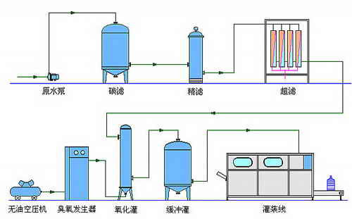 源水 →源水泵 →機械過濾器 →活性炭過濾器 →精密過濾器 →中空纖維超濾主過濾系統(tǒng)