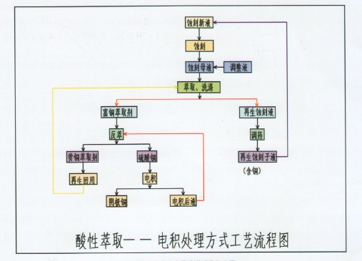 本公司研發(fā)的蝕刻液一萃取一電積(ET—SX—EW)再生閉路循環(huán)工藝,使用本工藝處理失效蝕刻液時(shí),可隨意調(diào)節(jié),在被萃 取液中能萃取一定量的銅或全部的銅,萃取出來的銅,可以用電解法生產(chǎn)紫銅板或用生產(chǎn)硫酸銅。萃取后的余液中可循環(huán)再用物質(zhì) 基本無(wú)損失,再生后返回企業(yè)酸、堿蝕刻工序中循環(huán)使用。