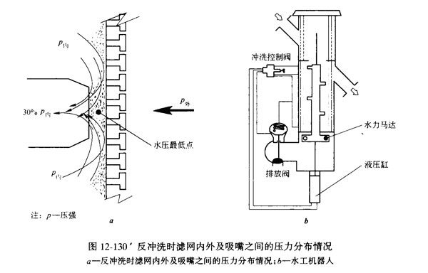 整個清洗過程大致進行5~10s,進行反沖洗時不間斷供水,反沖洗時濾網(wǎng)內(nèi)外及吸嘴之間的壓力差分布情況見圖12-130。反沖洗時只是吸嘴與細濾網(wǎng)之間很小的局域壓力發(fā)生變化,而收集器與液壓缸的動作也不影響正常供水。同時,在進行反沖洗時所消耗的濾后清水量很少,大約只占總過濾水量的1%以下,清洗過后其余的濾后清水地經(jīng)出口排出。以流量300m3/h的過濾器為例:其反沖洗流量為35~40m3/h,反沖洗時間7~15s,反沖洗水量為80~160L。