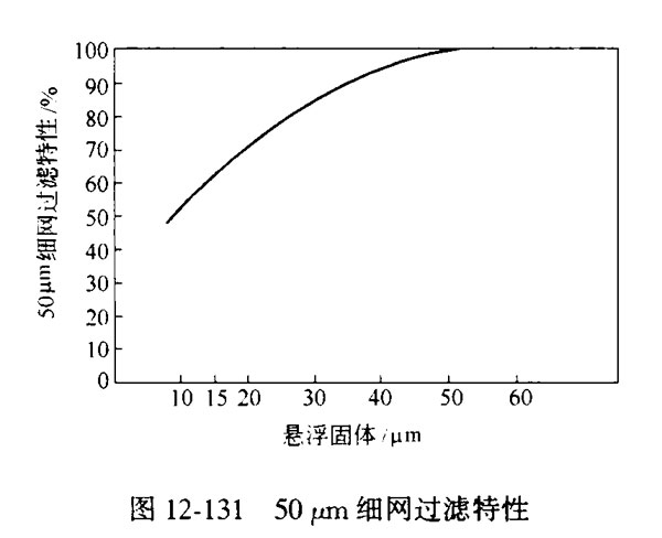 (3) 過濾精度高,可以除去細小微粒。自動反沖洗過濾機在首鋼應用中過濾精度最小為15μm,現(xiàn)以50微米細網(wǎng)過濾特性曲線(見圖12-131)來說明自動反沖洗過濾機應用的過濾效果。