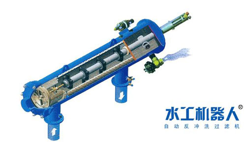 北京沃特瑞環(huán)境保護技術有限公司生產(chǎn)的自動反沖洗過濾機是我國唯一能夠實現(xiàn)水利動作,無須任何外來能源的制造商,并獲得3項國家級專利,該機不用外來能源,即不用電、不用氣,只要管道中有水流動即可進行過濾,是傳統(tǒng)過濾器和砂濾設備的替代產(chǎn)品,過濾過程大體分3 個過程:粗濾、細濾和反沖洗。該機的結構主要由筒體、粗粗網(wǎng)、細濾網(wǎng)、收集器、反沖洗控制器、液壓馬達、液壓缸、液壓閥等組成。