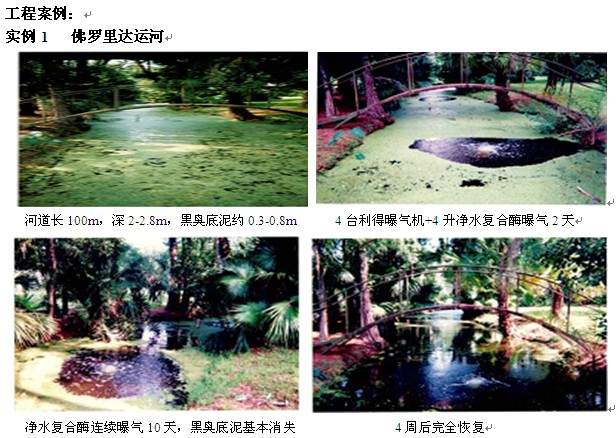 本公司主要采用生物治理措施,加強(qiáng)河道生態(tài)修復(fù)。水生態(tài)系統(tǒng)的內(nèi)部調(diào)控尤其是提高水體自身的生物凈化作用才是解決水體黑臭的長久之計。治理時主要使用利得復(fù)合酶,結(jié)合利得曝氣機(jī)。根據(jù)水質(zhì)不同情況采取相應(yīng)的治理措施。
