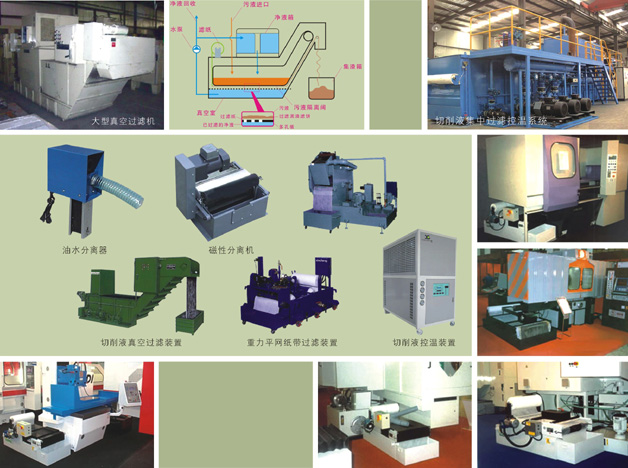 以上產(chǎn)品主要針對(duì)新一代的機(jī)械加工中的冷卻切削液進(jìn)行凈化。主要將加工切削液中的雜質(zhì)(切屑、砂輪粉末)過(guò)濾干凈。過(guò)濾精度達(dá)到5~10um級(jí),對(duì)于工作要求較高的場(chǎng)合,可以對(duì)切削液冷卻恒溫控制。
