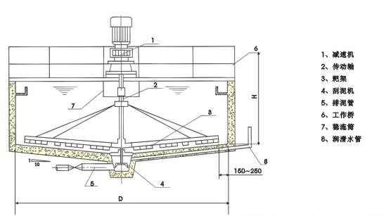 構(gòu)造及工作過程: 中心傳動(dòng)懸掛式刮泥機(jī),由工作橋、小刮板、穩(wěn)流筒、刮泥桁架、溢流裝置、中心支座、驅(qū)動(dòng)機(jī)構(gòu)、刮渣刮板、電控箱組成。