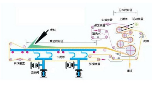 二次脫水采用壓榨脫水,物料在真空抽濾后形成濾餅,濾餅在上、下濾布的夾帶下,隨即進(jìn)入壓榨脫水,壓榨脫水后濾餅含水率再次降低3-5%。