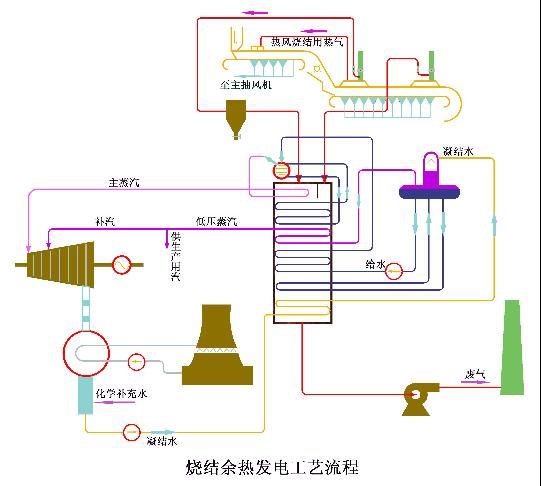 利用鋼鐵行業(yè)燒結(jié)環(huán)冷機(jī)的低溫(200-450℃)廢煙氣產(chǎn)生蒸汽發(fā)電。