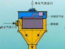 含塵氣流經(jīng)風(fēng)道進(jìn)入中部箱體(塵氣箱),當(dāng)含塵氣體由塑燒板的外表面通過(guò)塑燒板時(shí),粉塵被阻留在塑燒板外表面的PTFE涂層上,潔凈氣流透過(guò)塑燒板外表面經(jīng)塑燒板內(nèi)腔進(jìn)入凈氣箱,并經(jīng)排風(fēng)管道排出。隨著塑燒板外表面粉塵的增加,電子脈沖控制儀可按定阻或定時(shí)控制方式,自動(dòng)選擇需要清理的塑燒板,觸發(fā)打開(kāi)噴吹閥,將壓縮空氣噴入燒結(jié)板內(nèi)腔中,反吹掉聚集在塑燒板外表面的粉塵,粉塵在氣流及重力作用下落入料斗。