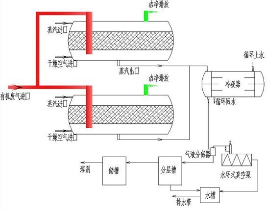企業(yè)在生產(chǎn)過(guò)程中產(chǎn)生的有機(jī)廢氣,先經(jīng)過(guò)前處理裝置:先經(jīng)阻火器、過(guò)濾器去除尾氣中的顆粒雜質(zhì),再經(jīng)過(guò)表冷器冷卻降溫。然后再由風(fēng)機(jī)加壓后進(jìn)入吸附罐體通過(guò)活性炭進(jìn)行吸附,經(jīng)過(guò)吸附的尾氣即潔凈排放。同時(shí)第二個(gè)吸附器進(jìn)行脫附工作,吸附一定數(shù)量有機(jī)氣體的活性炭,用水蒸汽(或熱氮?dú)?進(jìn)行脫附解析。脫附出的有機(jī)溶劑和水蒸汽一起進(jìn)入冷凝器進(jìn)行冷凝,冷凝成液體與吸附器體內(nèi)的冷凝液匯合進(jìn)入冷凝器冷卻至35℃以下,有機(jī)溶劑和冷凝水一起進(jìn)入分層槽,經(jīng)重力分層,根據(jù)溶劑屬性,大于水密度的溶劑,漂浮在上層且自動(dòng)溢流至儲(chǔ)槽;大于水密度的溶劑,沉淀在下層且自動(dòng)流入至儲(chǔ)槽。然后經(jīng)輸送泵送出入桶,分層出的冷凝水排入污水管道。脫附完畢后,進(jìn)入干燥過(guò)程,即用新鮮自然風(fēng)將活性炭中的水分吹干并降溫到常溫,保證活性炭處于最佳的吸附狀態(tài)。