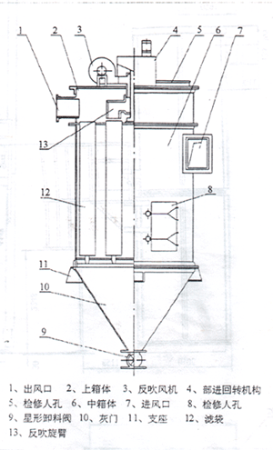 4、反吹風(fēng)機(jī)安裝在頂蓋上,(隨機(jī)配套)利用上箱凈化氣體增壓反吹,節(jié)省了反吹風(fēng)管路,并減少了漏氣部位。