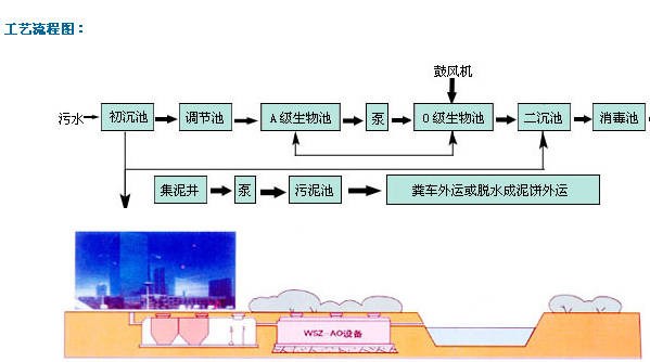 WSZ-A 型設(shè)備的設(shè)計主要是針對生活污水和與之類似的工業(yè)有機污水的處理。其主要處理手段是采用目前較為成熟的生化處理技術(shù)——接觸氧化法,水質(zhì)參數(shù)按一般生活水水質(zhì),進(jìn)水 BOD 20Omg/l ,出水 BOD 20mg/l 指標(biāo)設(shè)計,總共有六部份組成: (1) 初沉池; (2) 接觸氧化池; (3) 二沉池; (4) 消毒池、消毒裝置; (5) 污泥池; (6) 風(fēng)機房、風(fēng)機;