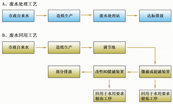 造紙綜合排放廢水回用前與回用后系統(tǒng)工藝流程示意圖如下: