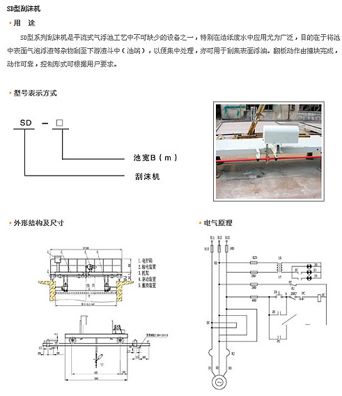 SD型刮沫機(jī)是平流式氣浮池工藝中不可缺少的設(shè)備之一,特別在造紙廢水中應(yīng)用尤為廣泛,目的在于將池中表面氣泡浮渣等雜物刮至下游渣斗中,以便集中處理,亦可以用于刮集表面浮油。