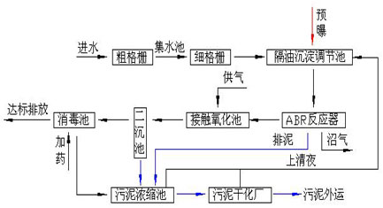 屠宰廢水中含有大量的血污、油脂、油塊、未消化的食物和糞便等物質(zhì),具有較高的有機(jī)物濃度,而且動(dòng)植物油濃度較高,其參數(shù)CODcr為1100-1200mg/l,BOD5為500-600mg/l,SS為800-1200mg/l,油脂為60-70 mg/l,pH為7-8,該廢水屬于中高濃度的有機(jī)廢水,含有大量易生物降解的有機(jī)物,具有良好的可生化性,因而宜采用以生物處理方法為主的處理工藝。