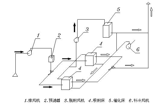 本裝置根據(jù)吸附(效率高)和催化燃燒(節(jié)能)兩個(gè)基本原理設(shè)計(jì),采用雙氣路連續(xù)工作,一個(gè)催化燃燒室,兩個(gè)吸附床交替使用。先將有機(jī)廢氣用活性炭吸附,當(dāng)快達(dá)到飽和時(shí)停止吸附,然后用熱氣流將有機(jī)物從活性炭上脫附下來使活性炭再生;脫附下來的有機(jī)物已被濃縮(濃度較原來提高幾十倍)并送往催化燃燒室催化燃燒成二氧化碳及水蒸氣排出。當(dāng)有機(jī)廢氣的濃度達(dá)到2000PPm以上時(shí),有機(jī)廢氣在催化床可維持自燃,不用外加熱。燃燒后的尾氣一部分排入大氣,大部分被送往吸附床,用于活性炭再生。這樣可滿足燃燒和吸附所需的熱能,達(dá)到節(jié)能的目的。再生后的可進(jìn)入下次吸附;在脫附時(shí),凈化操作可用另一個(gè)吸附床進(jìn)行,既適合于連續(xù)操作,也適合于間斷操作。