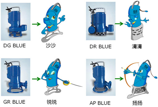 藍(lán)色系列水泵是澤尼特的主推產(chǎn)品,分為標(biāo)準(zhǔn)版和專業(yè)版。標(biāo)準(zhǔn)版有DG,DR兩個(gè)系列,專業(yè)版除了DG,DR外,還有AP,GR系列。產(chǎn)品主要應(yīng)用于民用和工業(yè)領(lǐng)域,兩年質(zhì)保。2009年4-5月,澤尼特為了提高藍(lán)色系列水泵的知名度和廣域度,特地推出了“藍(lán)色精靈”活動(dòng)。4個(gè)系列的水泵,分別對(duì)應(yīng)4款可愛的卡通形象,并且都有各自獨(dú)特的名字。DG系列,漩渦葉輪,擅長(zhǎng)應(yīng)用在含沙顆粒的環(huán)境中,所有叫做“沙沙”;DR系列,半開式多流通葉輪,適合輸送清水和輕度污水,叫做“清清”;GR系列,帶有切割刀頭,所以卡通形象手上拿了把刀,叫做“銳銳”;AP系列,高揚(yáng)程半開式多流道鑄鐵葉輪,叫做“揚(yáng)揚(yáng)”,手拿長(zhǎng)劍。