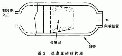 圖1是干燥過(guò)濾器的結(jié)構(gòu)圖。其外殼是用紫銅管收口成型,兩端進(jìn)出接口有同徑和異徑兩種,進(jìn)端為粗金屬網(wǎng),出端為細(xì)金屬網(wǎng),可以有效地過(guò)濾雜質(zhì)。內(nèi)裝吸濕特性?xún)?yōu)良的分子篩作為干燥劑,以吸收制冷劑中的水分,以確保毛細(xì)管暢通和制冷系統(tǒng)正常工作。當(dāng)干燥劑因吸收水過(guò)多而失效時(shí),應(yīng)該及時(shí)進(jìn)行更換。