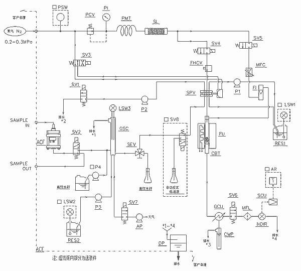 異常報警項目:加熱器溫度控制器異常、測量值上下限報警、載氣壓力低下(選裝)、無試劑(選裝)、無洗凈水(選裝)