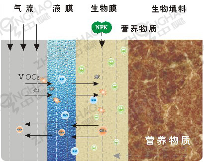 在適宜的條件下,臭氣(工業(yè)廢氣)經(jīng)過(guò)生物填料層,附著生長(zhǎng)在生物填料上微生物通過(guò)代謝活動(dòng)將廢氣中的污染物轉(zhuǎn)化為簡(jiǎn)單的無(wú)機(jī)物(如CO2、H2O、SO42-、NO3-等)及細(xì)胞組成物質(zhì)。在此過(guò)程中微生物對(duì)VOCs進(jìn)行氧化分解和同化合成,代謝產(chǎn)物一部分溶于液相,一部分作為細(xì)胞物質(zhì)或細(xì)胞代謝能源,還有一部分(如CO2)則從液相轉(zhuǎn)移到氣相。廢氣中污染物通過(guò)上述過(guò)程不斷減少,從而得到凈化。