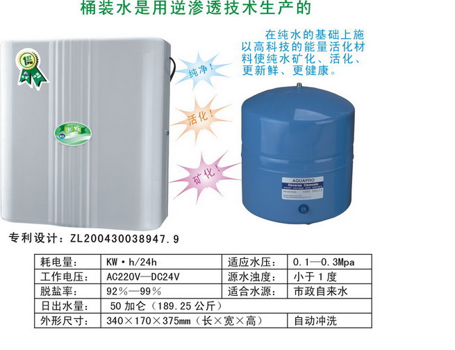 特點:全自動、智能化制水,設有濃縮液分流、高壓保護、低壓保護、智能沖洗裝置。