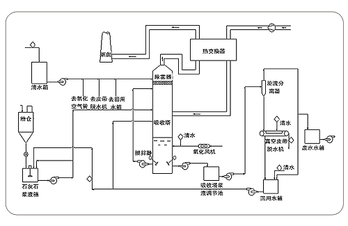 濾水回收至濾水箱重復(fù)利用,通過兩臺(tái)濾水泵(一用一備)送至石灰石制漿系統(tǒng)用來制漿及送至吸收塔用來調(diào)節(jié)吸收塔反應(yīng)池液位。