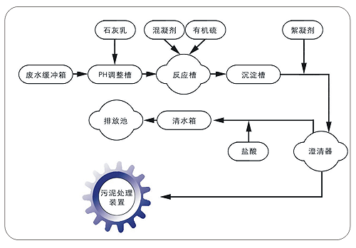 廢水輸送泵將脫硫廢水送至廢水貯存箱,通過曝氣風(fēng)機(jī)(一用一備)吹來的空氣進(jìn)行長時(shí)間曝氣,大面積接觸空氣進(jìn)行氧化,降低廢水的COD后,通過廢水泵(一用一備)打進(jìn)三聯(lián)箱,在pH調(diào)整槽內(nèi),通過添加Ca(OH)2,將pH調(diào)整到9.5左右,使部分重金屬沉淀下來。然后進(jìn)入反應(yīng)槽,在反應(yīng)槽內(nèi)加入有機(jī)硫,進(jìn)一步沉淀不能由氫氧化物沉淀下來的重金屬離子,如汞、鉛等,使其形成硫化物沉淀。反應(yīng)槽中形成的細(xì)小、分散的顆粒和膠體物質(zhì),懸浮物隨水流進(jìn)入絮凝槽,在緩慢、平滑的混合作用下,加入一定比例的混凝劑,使他們凝聚成絮凝體。在三聯(lián)箱出日管處加入高分子聚合電解質(zhì)作為助凝劑,其主要起吸附架橋作用,能降低顆粒表面張力,強(qiáng)化顆粒的長大過程,進(jìn)一步促進(jìn)氫氧化物、硫化物的沉積,絮凝物變得更大、更容易沉積,使其能在澄清器中沉淀分離出來。
