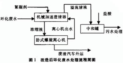 由于環(huán)化廢水水量大,固含率較低,初始條件達不到臥螺機的處理要求,為了提高臥螺機的工作效率,改造過程考慮先進行機械沉降,同時選用聚酯酰胺作為絮凝劑,提高廢水固含量,然后再進入臥螺機處理。改造技術(shù)流程見圖1。