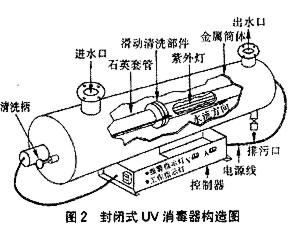 封閉式UV消毒器屬承壓型,用金屬筒體和帶石英套管的紫外線燈把被消毒的水封閉起來,結(jié)構(gòu)形式如圖2所示。
