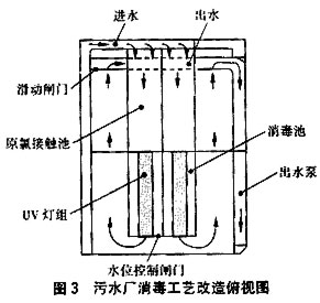 近年來,一些污水廠將原有的氯消毒系統(tǒng)改造成為紫外線消毒系統(tǒng),譬如美國新罕布什爾州、得克薩斯州、俄亥俄州等地的污水廠。因?yàn)閁V消毒接觸時間短、占用的空間小,故完全可以利用已有的氯接觸池改造成紫外線消毒系統(tǒng)。圖3為具有代表性的污水廠氯消毒改造成UV消毒的俯視圖。