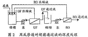 超濾膜技術(shù)目前在含油廢水處理中應(yīng)用最多,美國(guó)在1991年前后研究了一種陶瓷超濾膜處理采出水用于油田回注。國(guó)內(nèi)華北油田、江漢油田、勝利油田都有應(yīng)用超濾膜技術(shù)的報(bào)道。與傳統(tǒng)的絮凝分離方法相比,超濾膜處理綜合費(fèi)用更低。但是,用超濾膜處理含油廢水時(shí),由于低分子能夠穿透濾膜,所以BOD和COD去除率不高,常將超濾透過(guò)水再經(jīng)反滲透(或活性污泥法等生物法)進(jìn)行深度處理(圖2)。