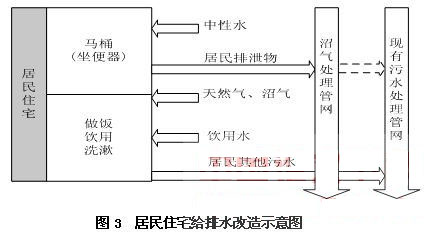 以居民住宅為例,將混合排污改造為居民排泄物和其他污水分類排污的方式,將統(tǒng)一給水改造為飲用水和中性水分類供給的方式(圖3)。