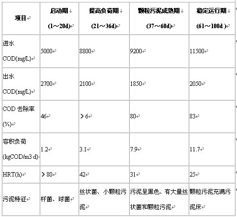 啟動運(yùn)行至第8天,反應(yīng)器內(nèi)有少量顆粒污泥出現(xiàn),此時容積負(fù)荷為1.2kgCOD/(m3•d);運(yùn)行到第33天時取污泥觀察,發(fā)現(xiàn)了直徑1.0mm左右的顆粒污泥,此時容積負(fù)荷為2.8kgCOD/(m3•d),污泥負(fù)荷為0.29kgCOD/(kgSS•d)。在維持COD去除率不低于70%的前提下,繼續(xù)提高容積負(fù)荷,以加快顆粒污泥的成熟,到第70天顆粒污泥已充滿污泥床。根據(jù)運(yùn)行情況,可把顆粒污泥形成過程劃分為啟動期、提高負(fù)荷期、顆粒污泥成熟期和穩(wěn)定運(yùn)行期,各時期運(yùn)行參數(shù)見表1。