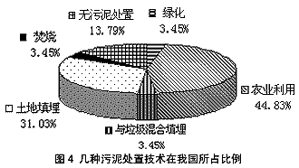 城市污水污泥的處置途徑包括土地利用、衛(wèi)生填埋、焚燒處理和水體消納等方法,這些方法都能夠容納大量的城市污水污泥,但因國(guó)家的不同而應(yīng)用情況有所不同。我國(guó)自80年代初第一座污水處理廠天津紀(jì)莊子污水處理廠建成投產(chǎn)后,污泥即由附近郊區(qū)農(nóng)民用于農(nóng)田。其后北京高碑店等污水處理廠的污泥也均用于農(nóng)田。隨著城市污水污泥產(chǎn)生量和污水處理廠的逐漸增多,目前我國(guó)已開始將污水處理廠污泥用于土地填埋和城市綠化,并將污泥作基質(zhì),制作復(fù)合肥用于農(nóng)業(yè)等。但在國(guó)內(nèi),總的狀況還是以污泥土地利用的形式為主,將污泥用于農(nóng)業(yè)。可由于國(guó)內(nèi)在污泥管理方面對(duì)污泥所含病原菌、重金屬和有毒有機(jī)物等理化指標(biāo)及臭氣等感官指標(biāo)控制的重視程度還不夠高,因此限制了對(duì)污泥的進(jìn)一步處置利用,圖4為幾種污泥處置技術(shù)在國(guó)內(nèi)所占的比例。