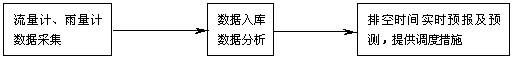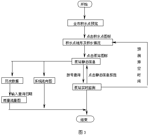 在通常情況下,分布在各泵站的遠(yuǎn)程流量計(jì)通過(guò)電話線自動(dòng)兩小時(shí)一次向服務(wù)器傳輸原始數(shù)據(jù),系統(tǒng)自動(dòng)整理數(shù)據(jù)后,將其存放在泵站數(shù)據(jù)庫(kù)中。這些數(shù)據(jù)為監(jiān)測(cè)泵站運(yùn)行情況、分析雨量與積水關(guān)系提供數(shù)據(jù)基礎(chǔ)。