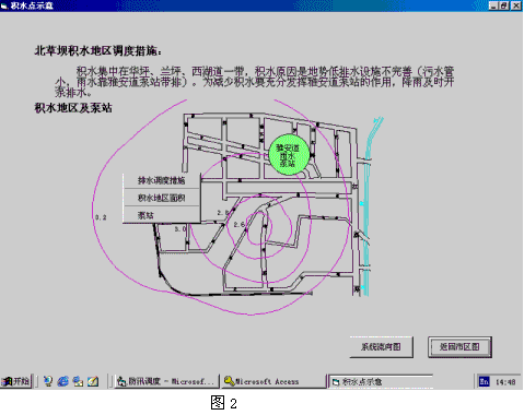 本系統(tǒng)主要以34片積水地區(qū)為研究對(duì)象。在每一積水地區(qū),按照區(qū)域的高程情況,以等高線為基礎(chǔ),排水管道分布為依據(jù),確定積水范圍。當(dāng)排除部分積水后,再重新按照等高線分布情況確定積水范圍,直至積水安全排除。見(jiàn)圖2。